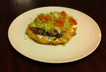 - Top fry bread with ground beef, lettuce, cheese, tomatoes and sour cream. You can also top with other of your favorite taco toppings, such as onion, ranch or guacamole